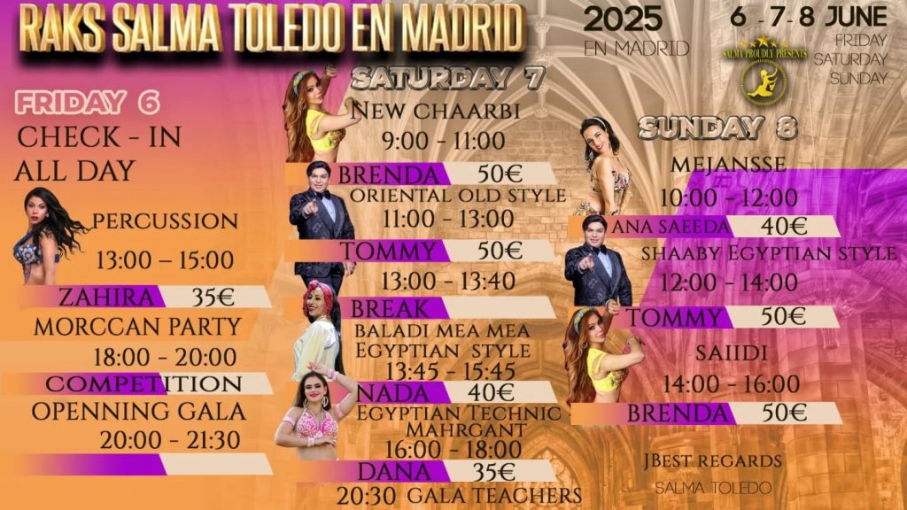 El equipo de la Escuela de Danza Salma te espera los días 6,7 y 8 de Junio de 2025. ¡No te lo pierdas! Reserva ya tu plaza contactando con salmalaroussi049@gmail.com  o al telefono +41 762379400
